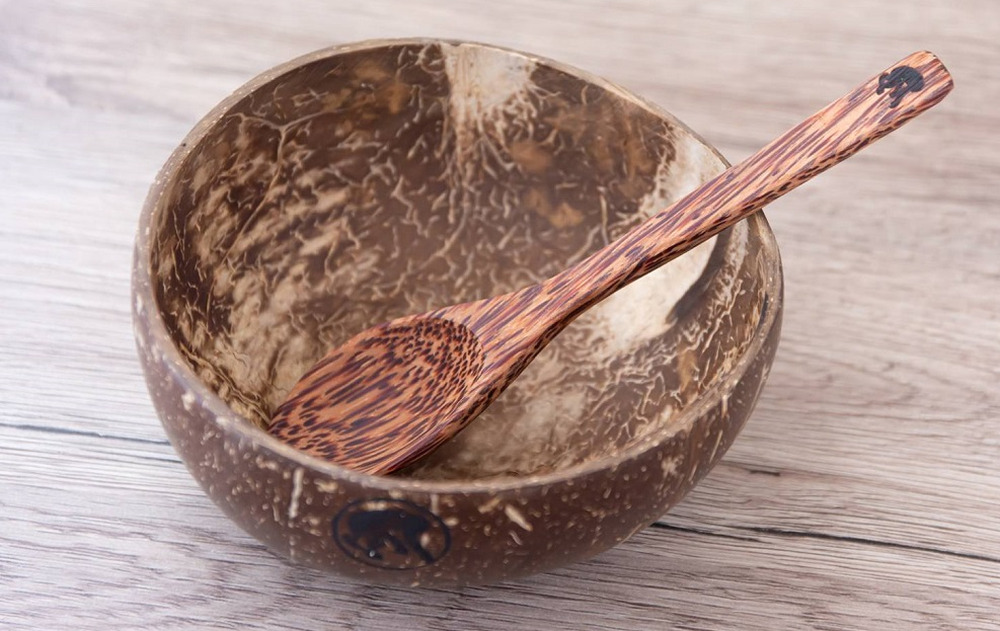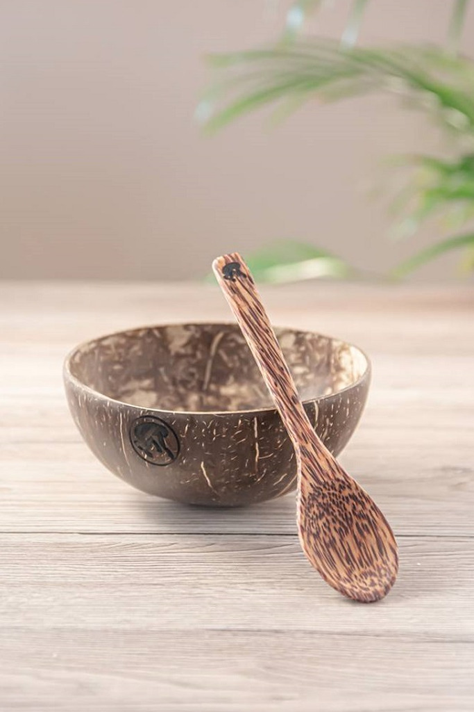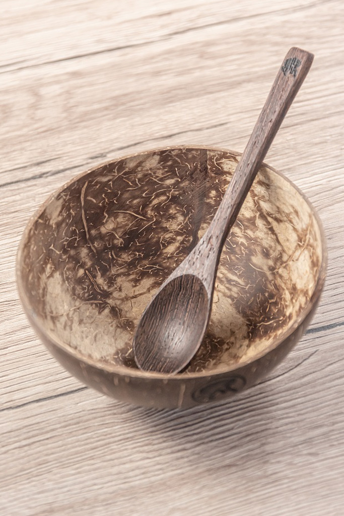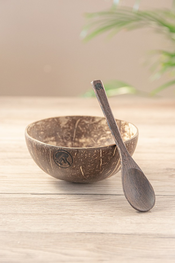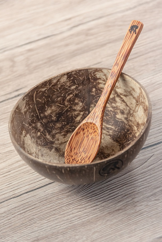 Set da tavola basico, composto da una Original coconut bowl e un Cucchiaio di legno naturale di palma da cocco/ebano.