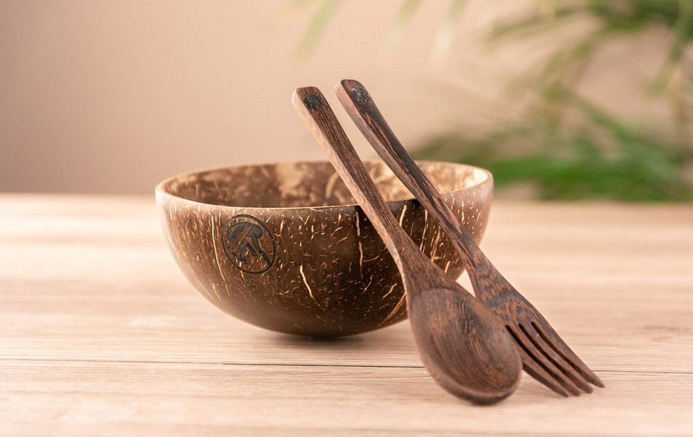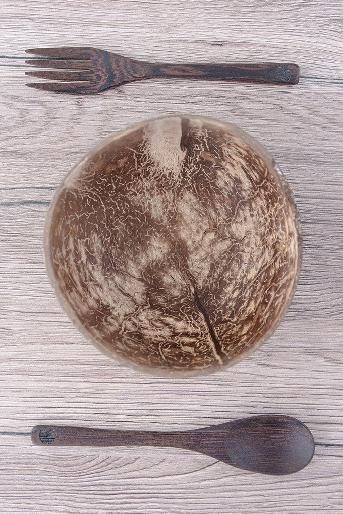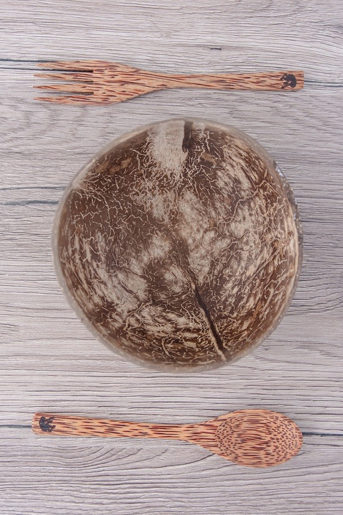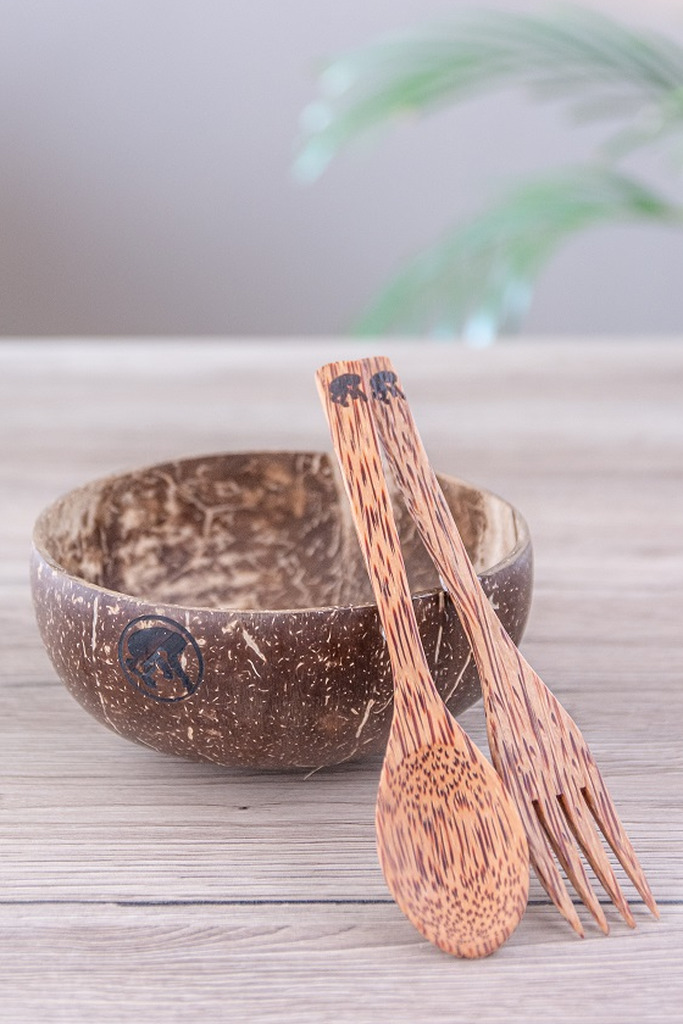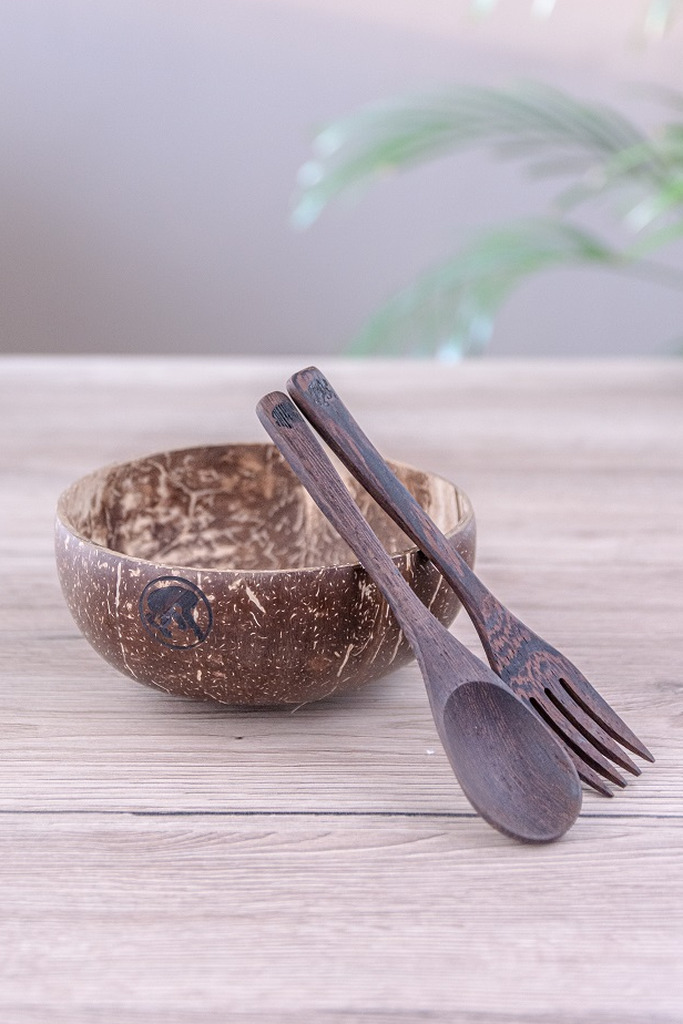 Set da tavola ecologico per una persona, comprendente una Original coconut bowl, una Forchetta e un Cucchiaio.